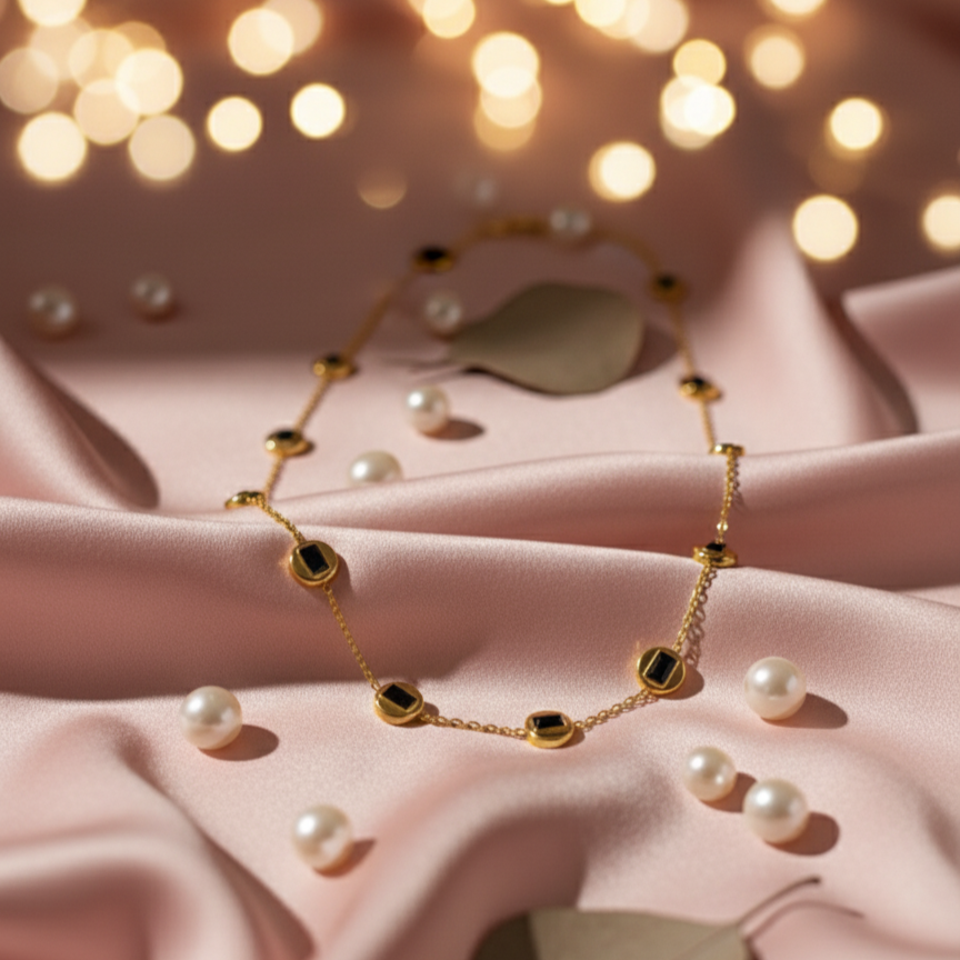 Contrast: Rich black stones set against a radiant gold chain.