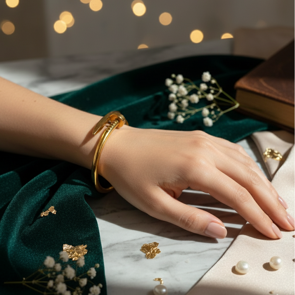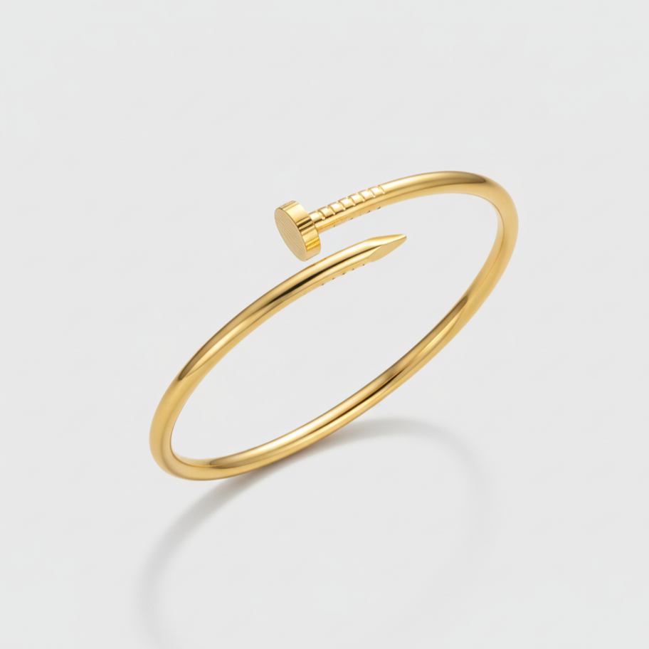 Dare to defy convention. The Nail Wrap Bangle transforms an everyday object into an extraordinary piece of industrial art for your wrist. With its sleek lines and polished gold finish, this bracelet is a symbol of strength, confidence, and a rebellious spirit.