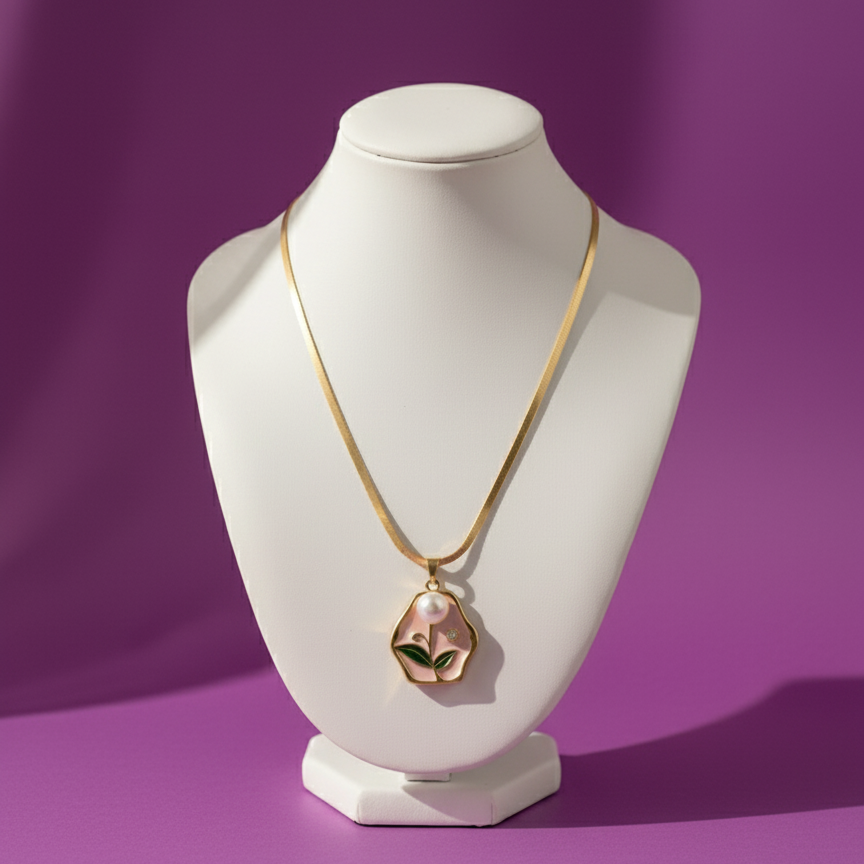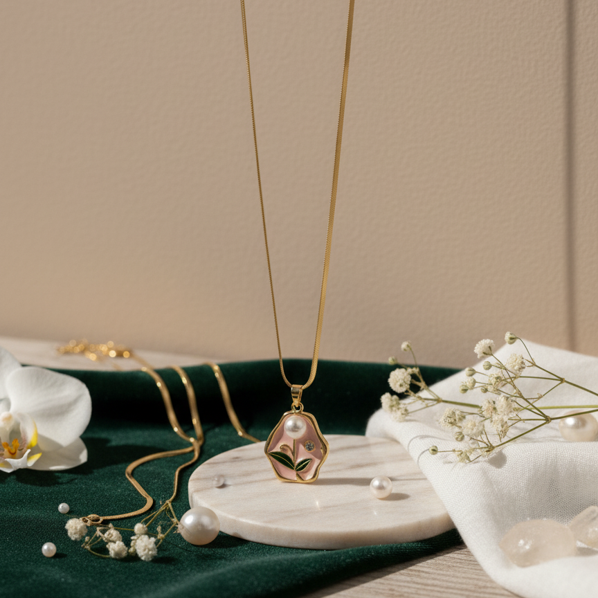 Discover timeless elegance with a modern twist. Our Bloom Pearl Pendant Necklace features a delicate flower, brought to life with a lustrous pearl set against a soft pink enamel backdrop. The intricate floral design is framed within a chic, geometric gold-toned pendant.
